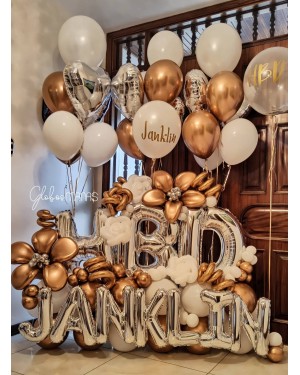 Grandioso Arreglo hecho principalmente con letras de globos.